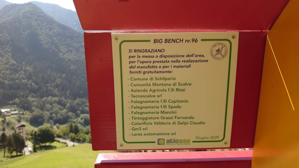 Panchina gigante di Schilpario, nr. 96, GIALLA-ROSSA: si trova in provincia di Bergamo e dal centro del paese ci si arriva tranquillamente a piedi, seguendo le indicazioni chiaramente riportate durante il tragitto. Ulteriori indicazioni le trovate leggendo Cosa fare a Schilpario con il cane. Per salire sulla panchina gigante bisogna arrampicarsi.