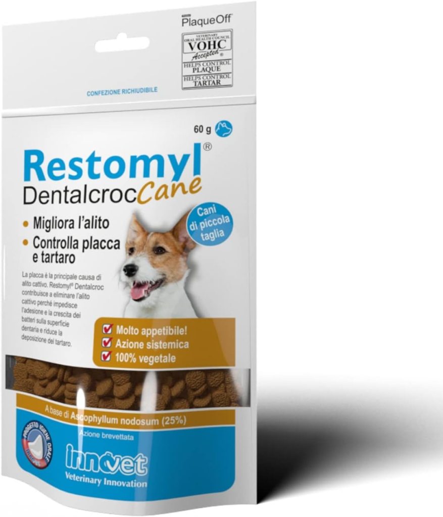 Restomyl Dentalcroc, supporto nutrizionale, migliora l’alito. Controlla e previene la placca e il tartaro dei cani. Sono crocchette che non sono adatte per alimentare il cane, ma semplicemente per mantenere il cavo orale pulito. Vanno pertanto utilizzate in aggiunta all’alimento di base abituale del cane. Come soluzione per la pulizia del tartaro del cane è un prodotto che, se gradito, non risulta fastidioso per il cane, come invece potrebbe essere lo spazzolino. Contiene infatti una particolare alga bruna (Ascophyllum nodosum), che viene assorbita dopo somministrazione orale e, attraverso la circolazione, raggiunge le ghiandole salivari per concentrarsi nella saliva. Impedisce la crescita sulla superficie dentaria della componente batterica della placca e riduce la deposizione del tartaro. Utile per cani con intolleranze alimentari. Adatto a cani di piccola taglia; da somministrare fino a 5 kg 4 crochette, da 6 a 10kg 8 crochette.