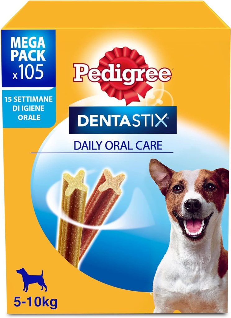 Pedigree Dentastix Snack per la Igiene Orale Ottimo prodotto per mantenere puliti i denti del cane, grazie alla particolare forma ad x e al tipo di consistenza permette di eliminare la placca che si deposita dopo ogni pasto sui denti. Da somministrare una sola volta al dì, l’effetto dura 24 ore. E’ considerato un alimento complementare, non ha coloranti ed è al gusto di pollo, attenzione però ai cani intolleranti o con allergia agli alimenti.