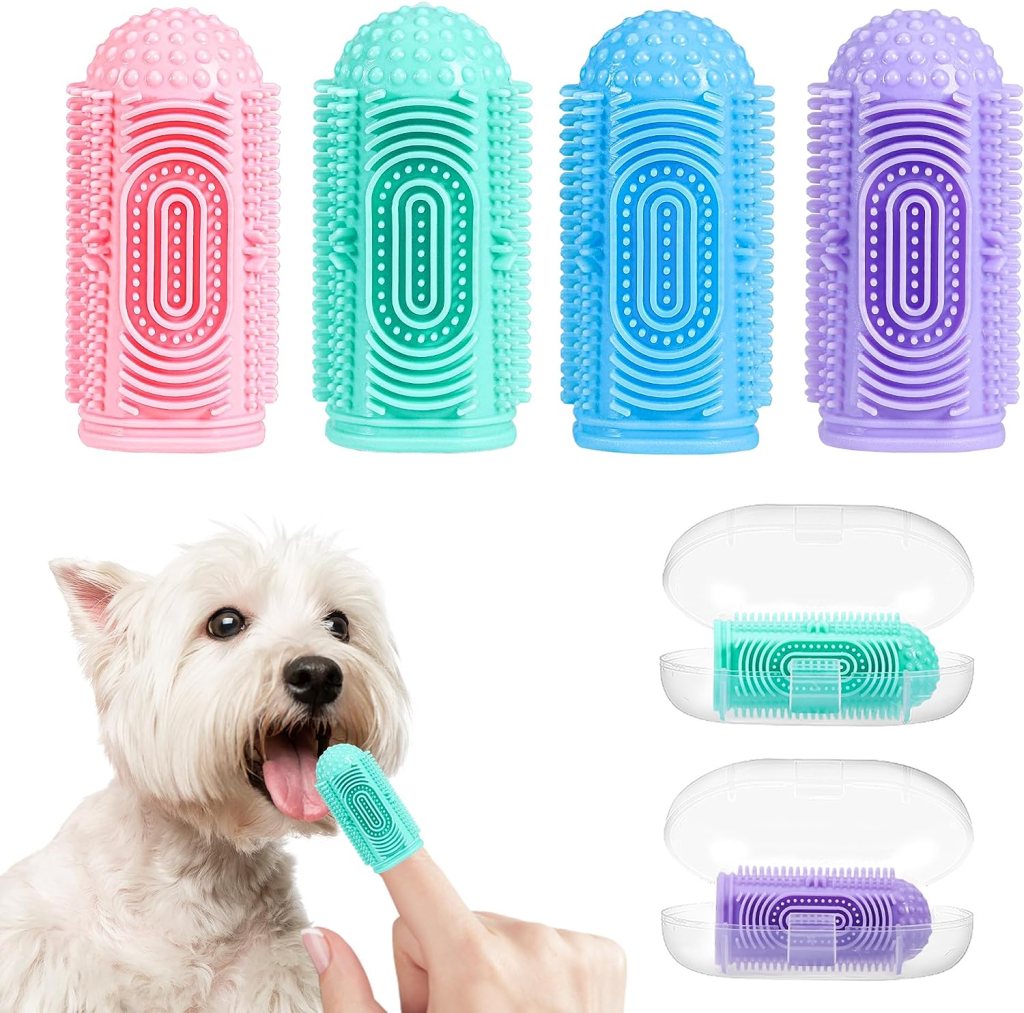 Spazzolino Denti Cane Silicone, da infilare sul dito indice e sfregare sui denti del cane. Il cane non deve essere forzato in alcun modo, deve accettare che gli venga messo il dito in bocca, altrimenti si rischia di sviluppare atteggiamenti di rifiuto, che possono successivamente comportare problemi comportamentali. Il silicone è morbido, ma aiuta a rimuovere la placca e impedisce la formazione del tartaro. Di solito più accettato rispetto allo spazzolino con le setole. Utile per cani di qualunque taglia.